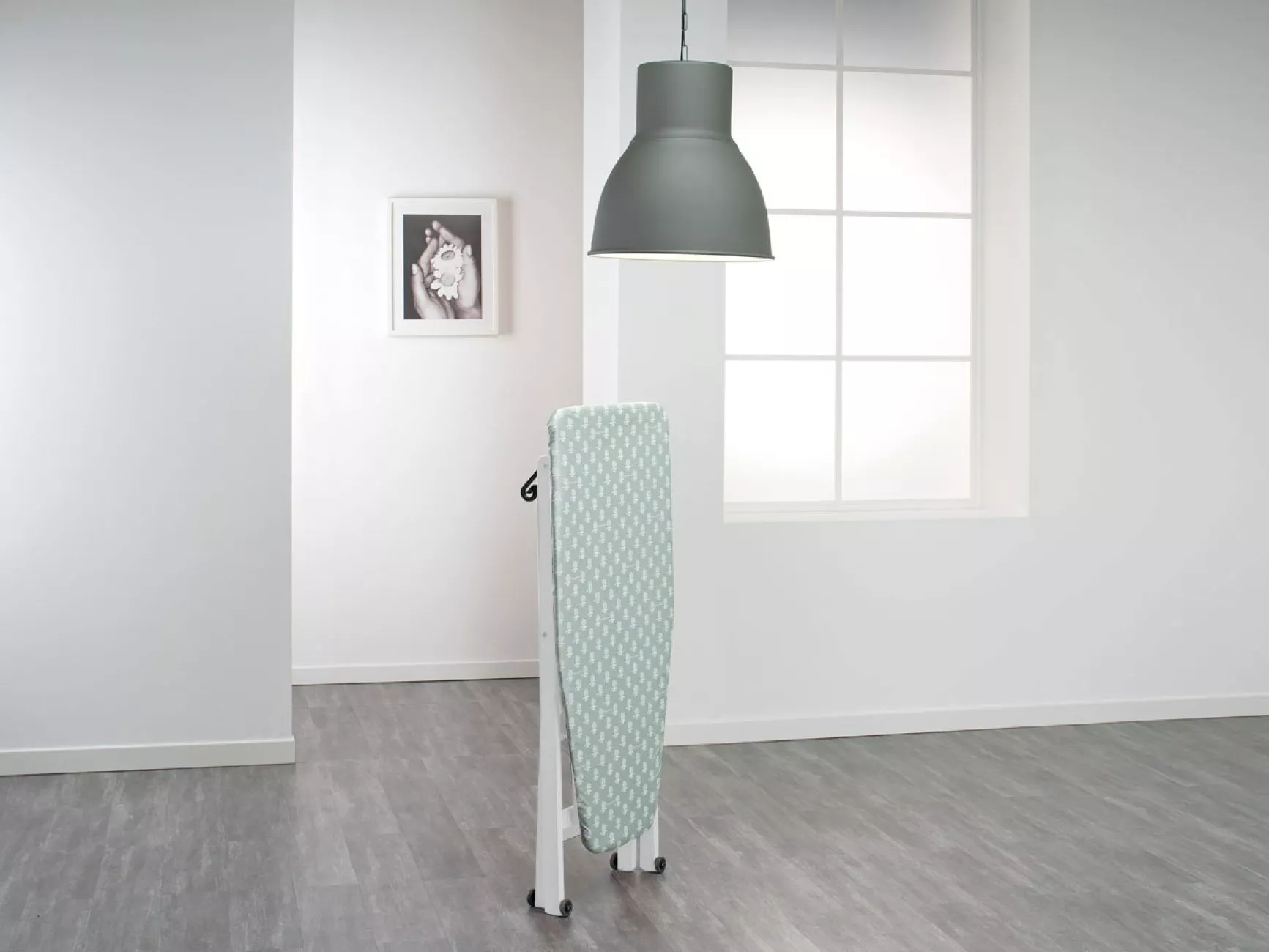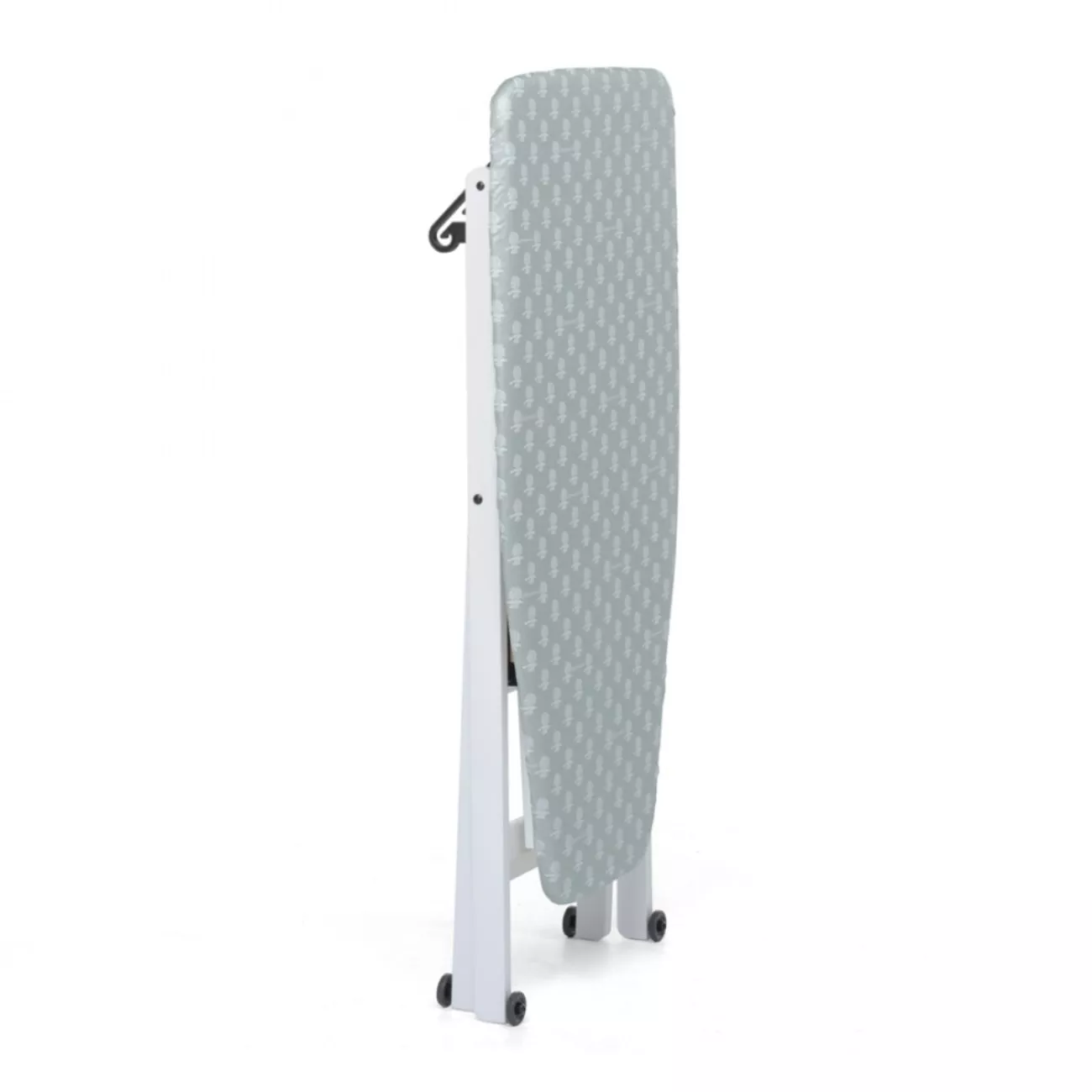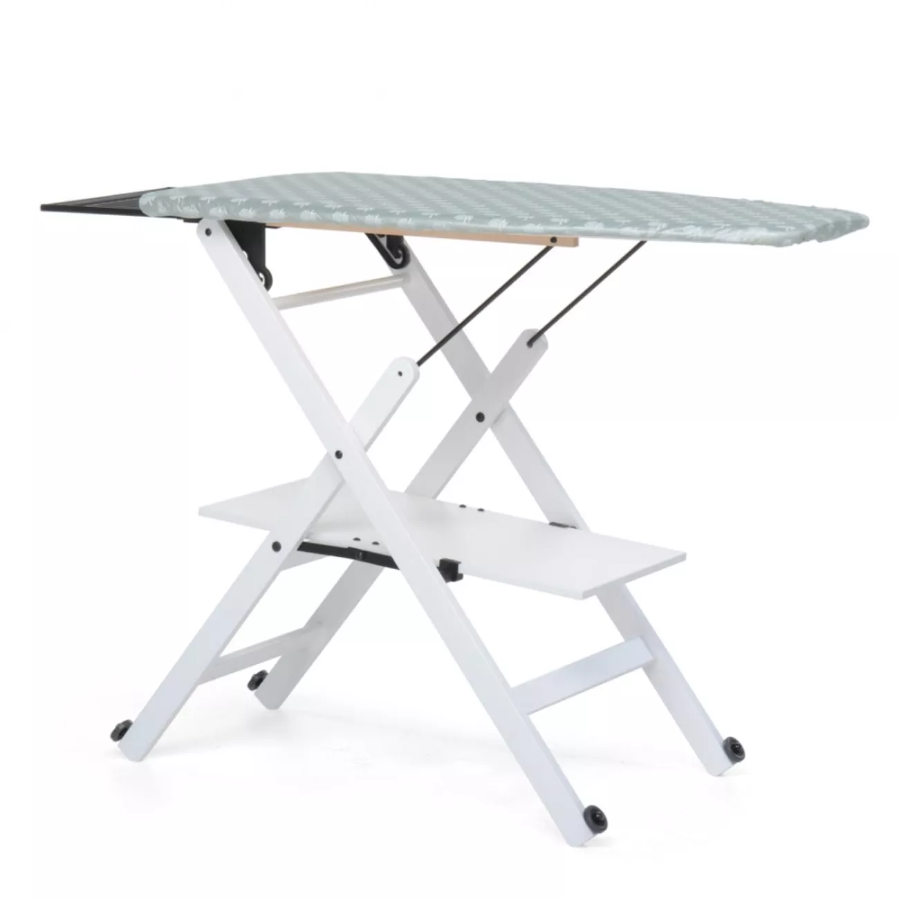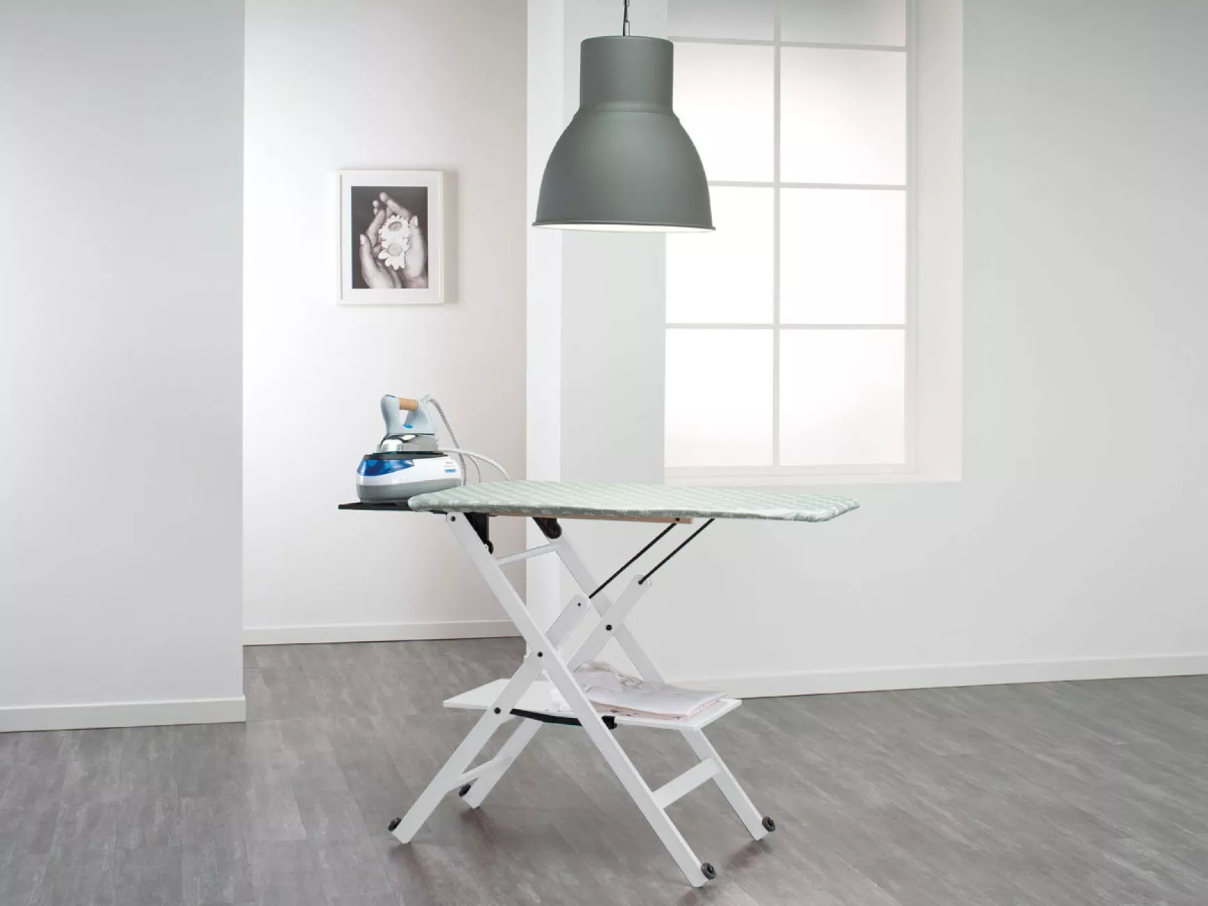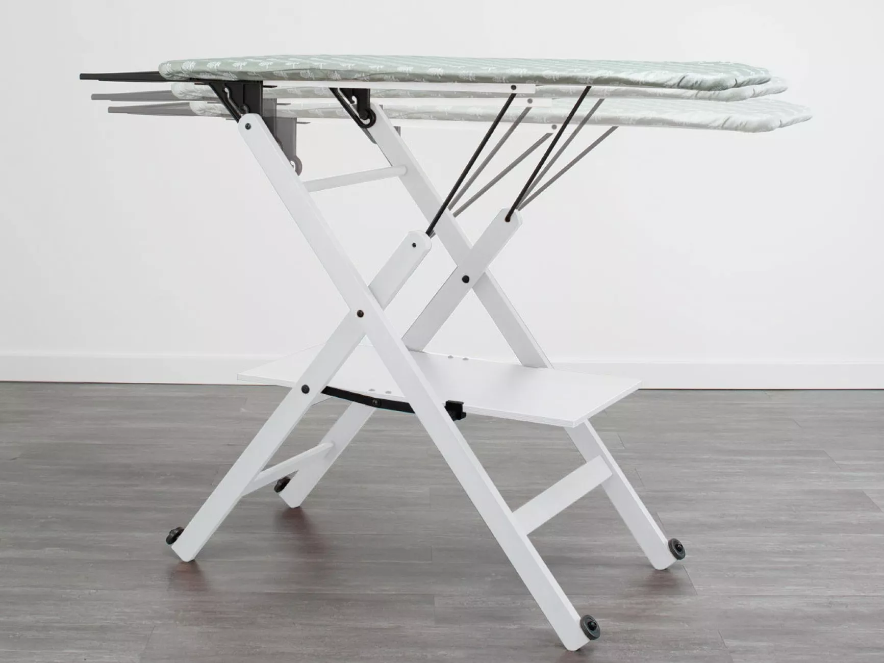 Прасувальна дошка-трансформер. Assai – бестселер, який виготовляється з 1980-х років, запатентований. У доладному стані займає 14см і легко переміщається на коліщатках. Заощаджує час прасування в 2 рази. Висота регулюється в трьох положеннях, дошка стійка під час інтенсивного прасування. Під робочою поверхнею розміщена полиця для погладженої білизни.