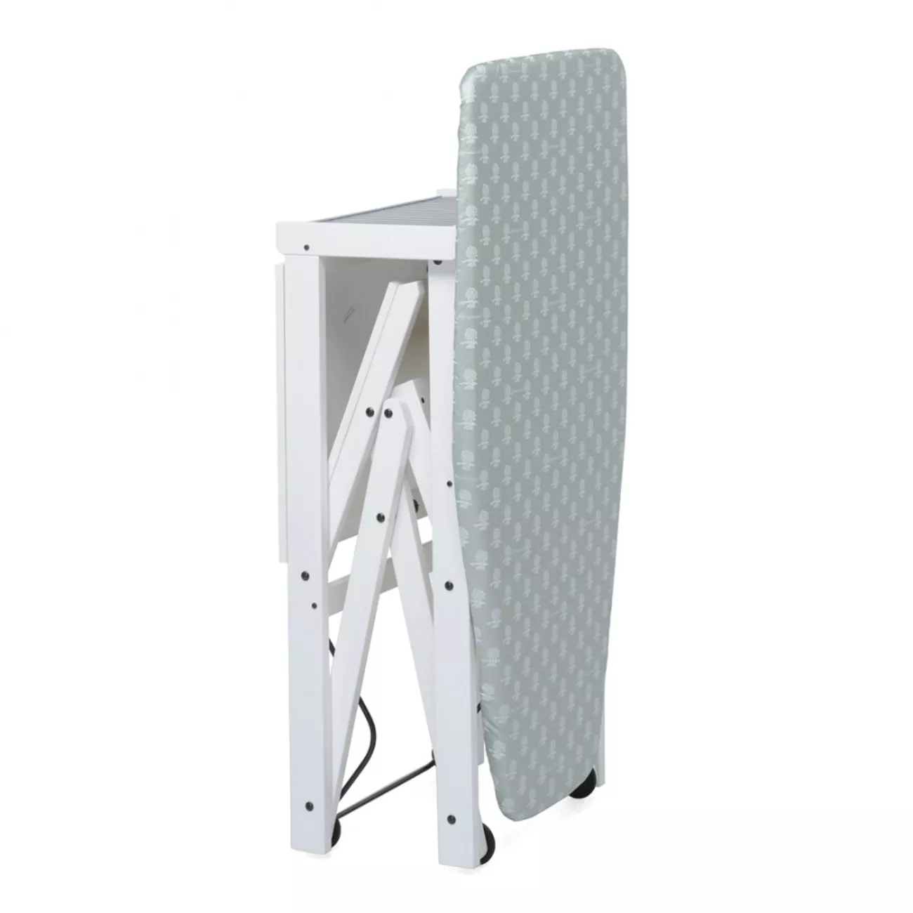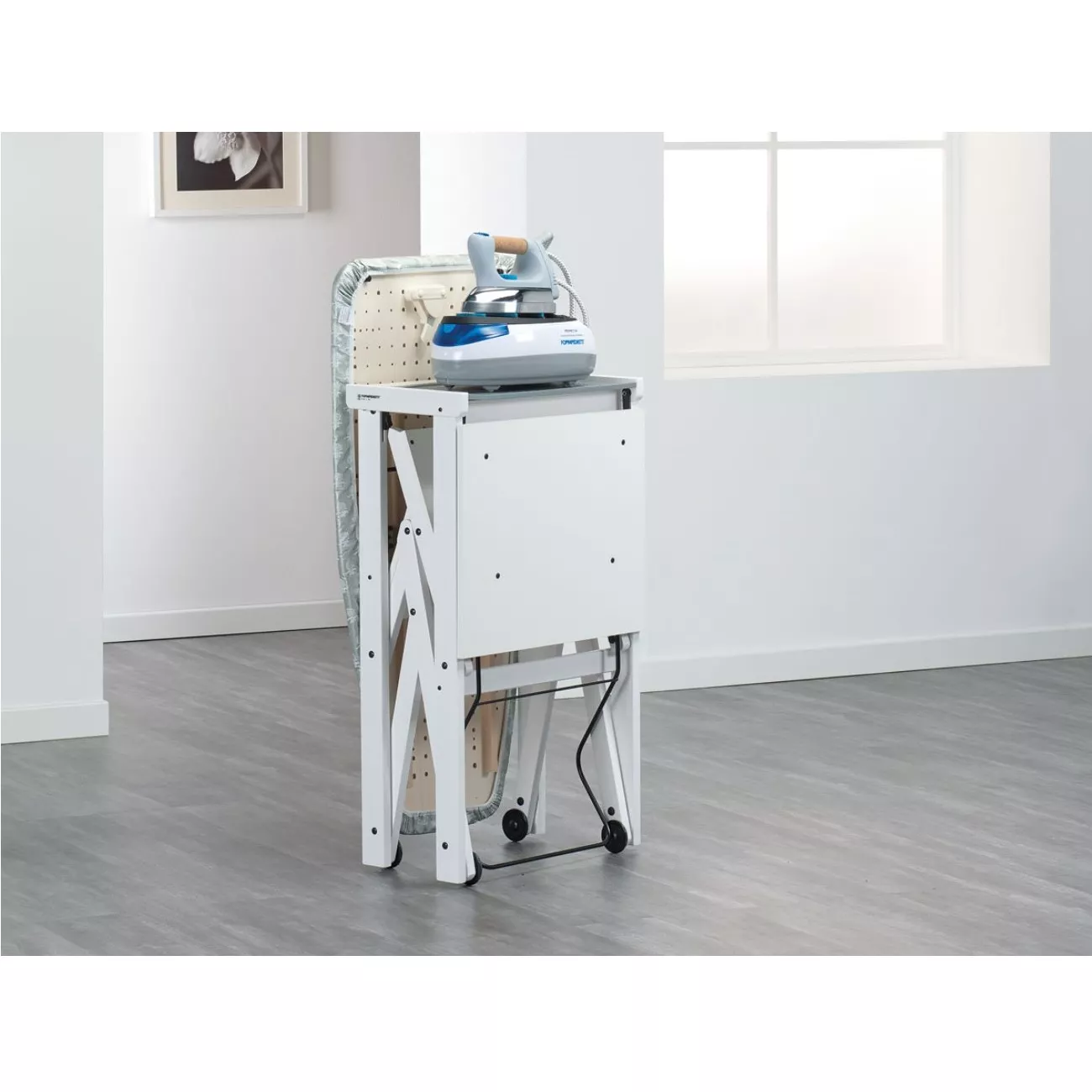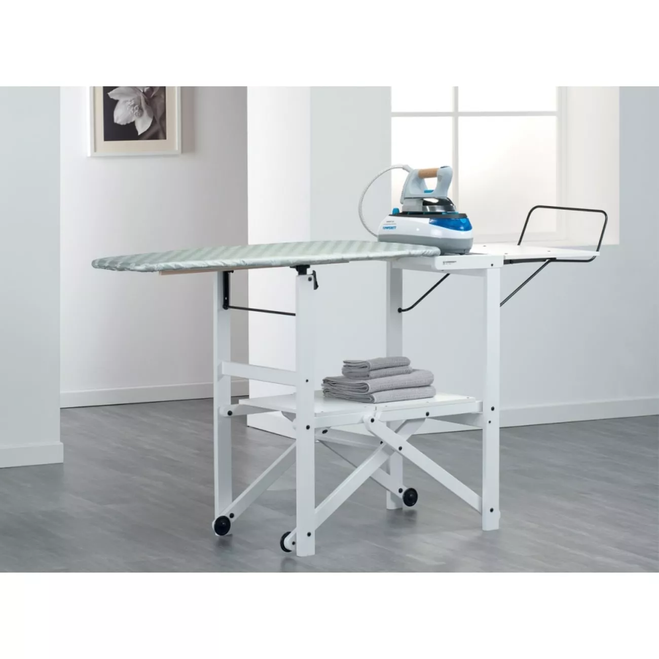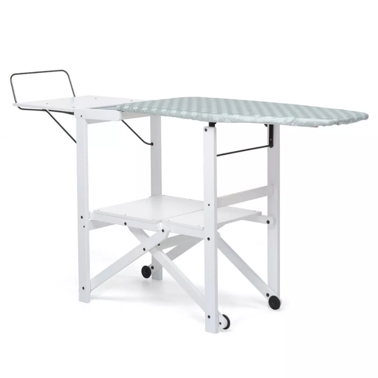 Складна прасувальна станція, запатентована заощаджує час прасування в 2 рази. Прасувальна дошка Asso має кілька полиць для погладженої білизни – під робочою поверхнею, а також збоку платформи для праски – як продовження робочої площі, що дозволяє не лише акуратно складати речі, але й забезпечує зручне розгладження комплектів постільної білизни. Бічна полиця завершується сталевим утримувачем для плічок. У складному стані зручно переміщається на коліщатках.