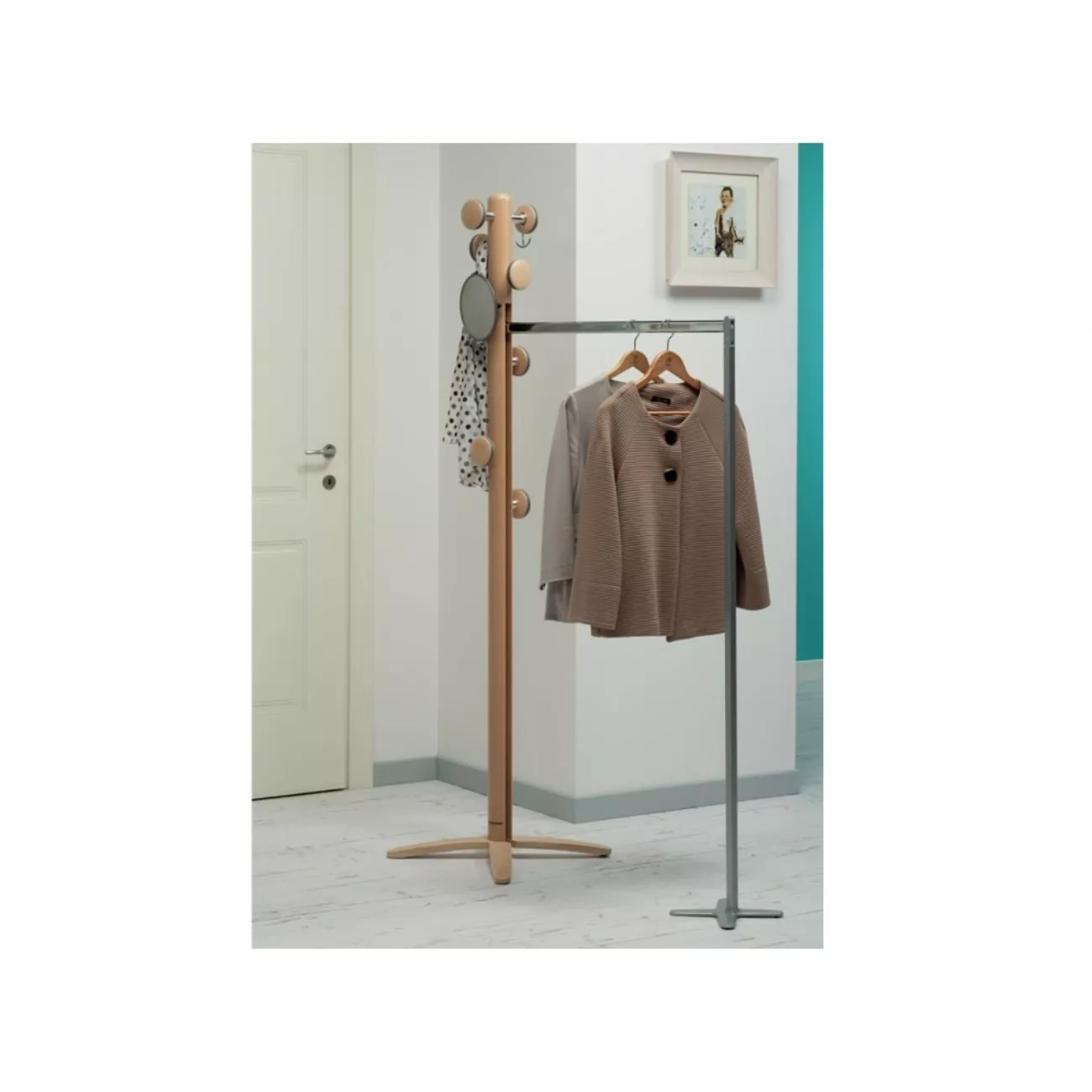 Дизайнерська вішалка з висувним кронштейном. Підлогову вішалку Espansiva зручно використовувати в коридорі, офісі, під час прийому гостей. Вішалка стане незамінною, якщо Ви очікуєте відвідувачів - просто дістаньте кронштейн з поперечиною і розвісьте плечики з їх одягом.
