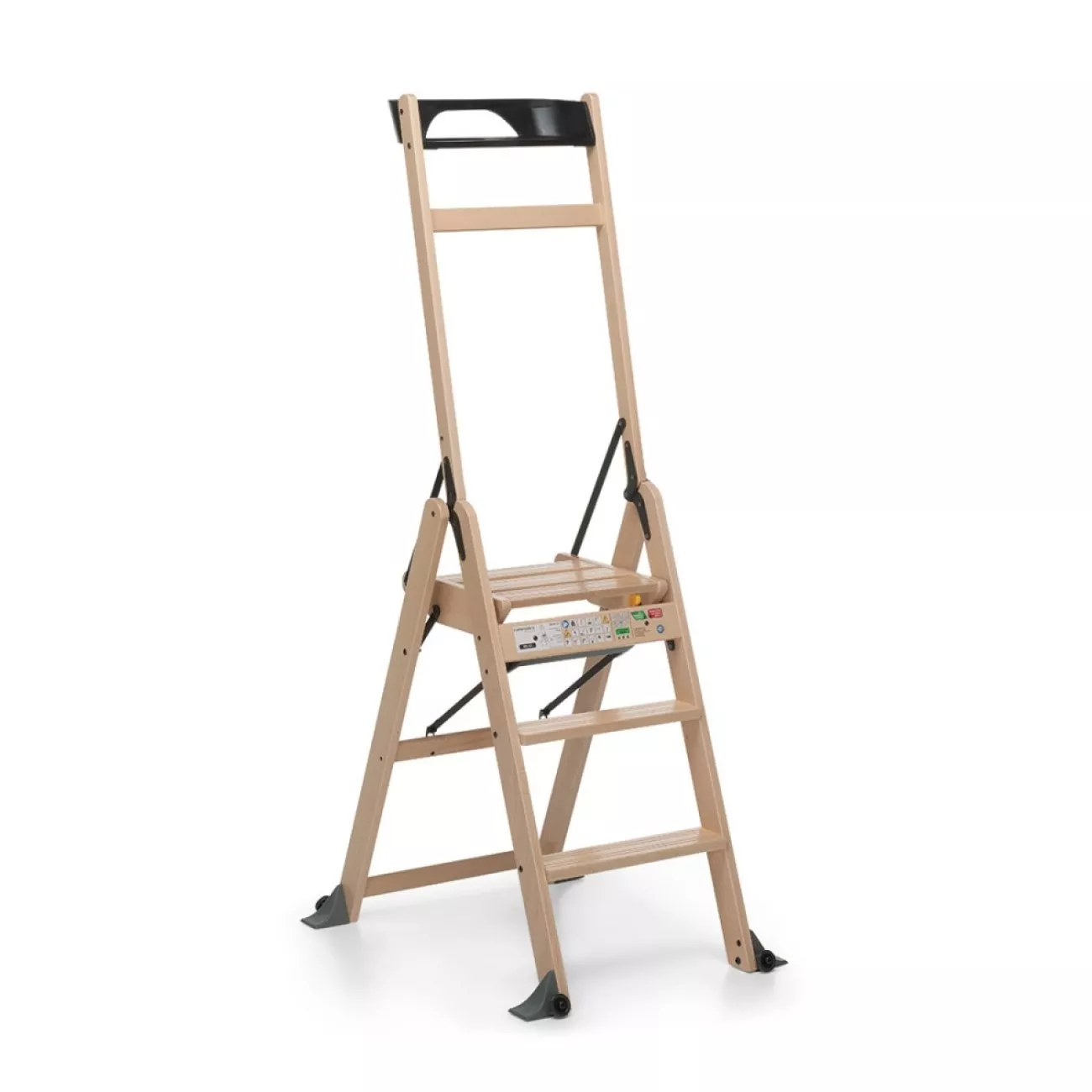 Складна побутова драбинка-трансформер на 3 ступені. Виконана із масиву бука. Стійка та безпечна. Максимальне навантаження – 150 кг. Нековзні сходи та платформа також виконані з бука. Вгорі розміщена зручна поличка для інструментів. Драбина «Ла Скала» легко складається і розкладається. Ніжки - з прогумованими накладками (для безпечної експлуатації). У зібраному стані драбини-трансформери LaScala легко переміщаються на коліщатках.