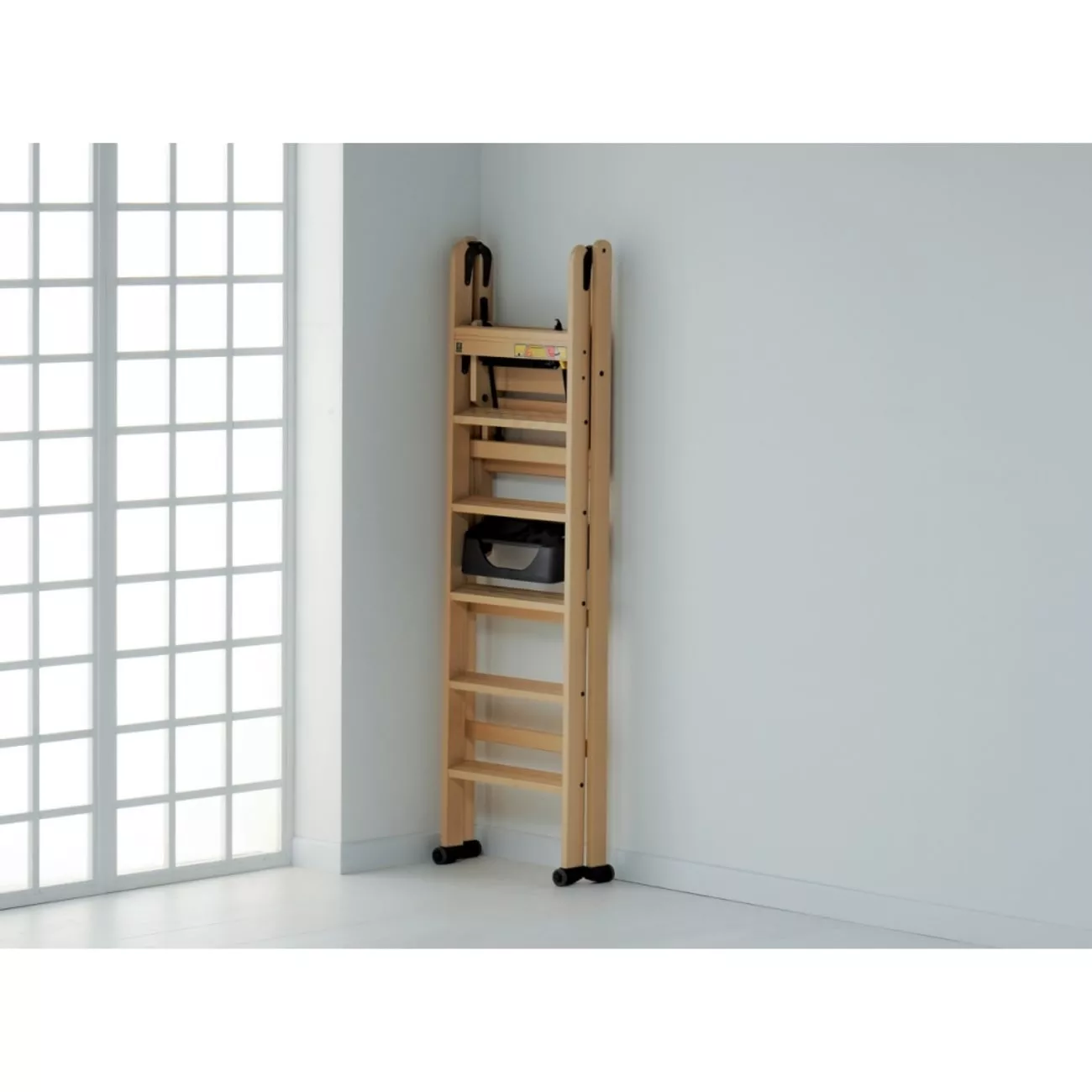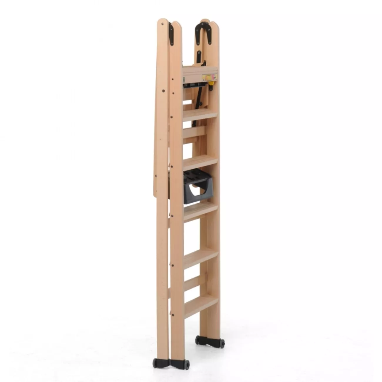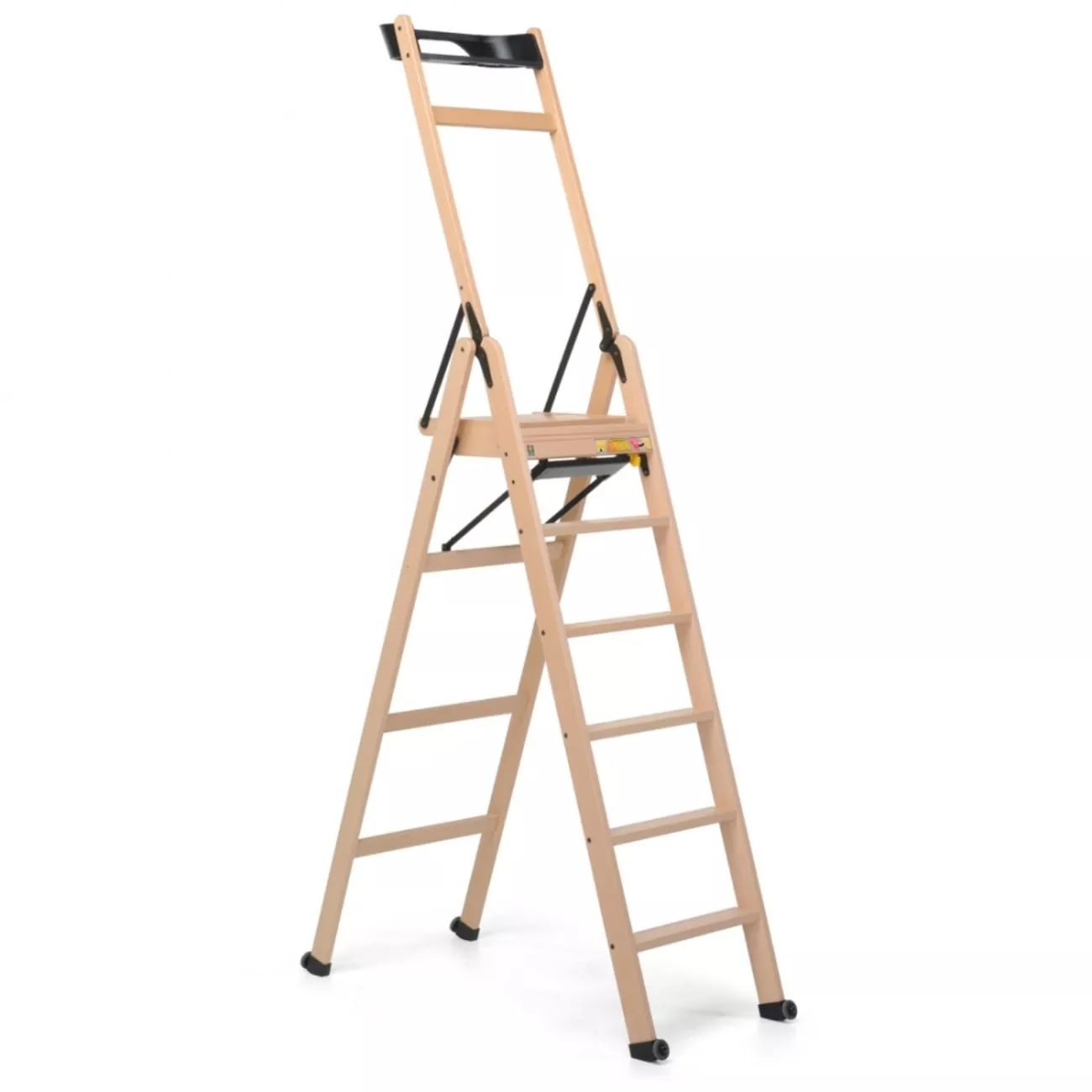 Складна побутова драбинка-трансформер на 6 ступенів. Виконана із масиву бука. Стійка та безпечна. Максимальне навантаження – 120 кг. Нековзні сходи та платформа також виконані з бука. Вгорі розміщена зручна поличка для інструментів. Драбина «Ла Скала» легко складається і розкладається. Ніжки - з прогумованими накладками (для безпечної експлуатації). У зібраному стані драбини-трансформери LaScala легко переміщаються на коліщатках.