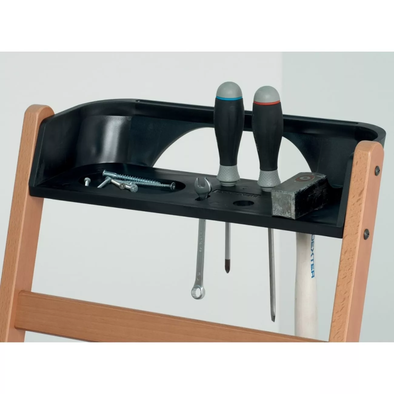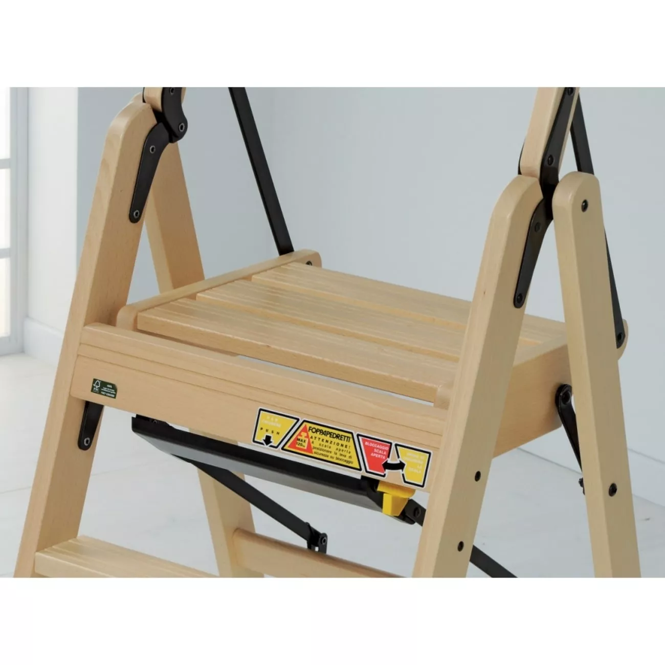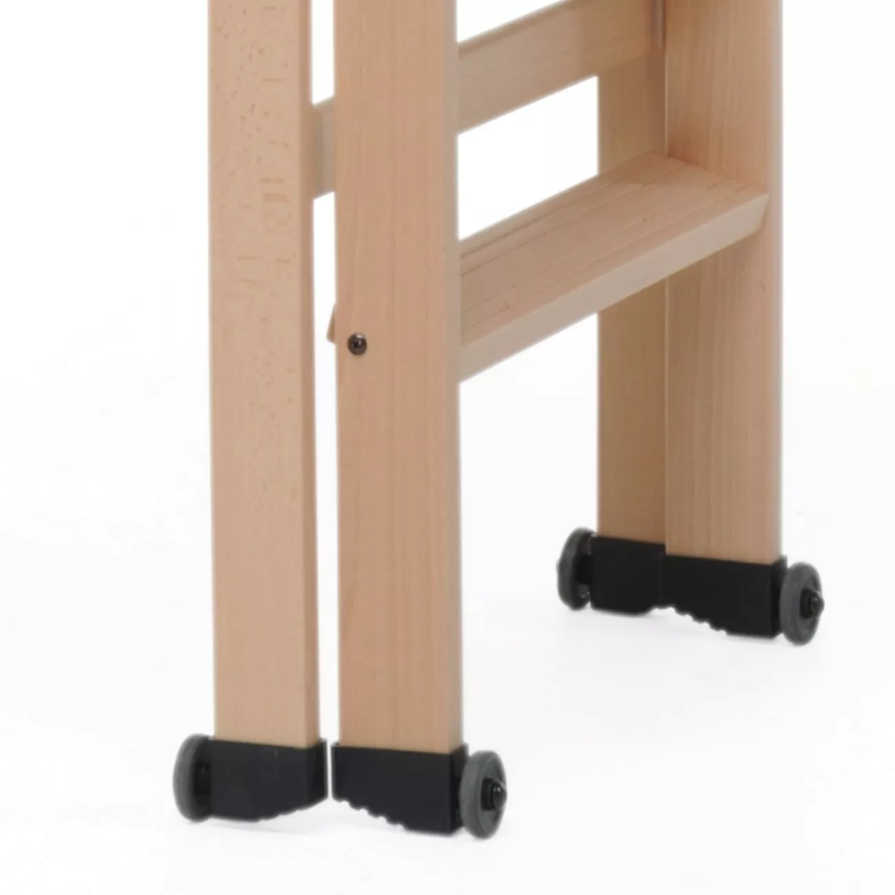 Складна побутова драбинка-трансформер на 6 ступенів. Виконана із масиву бука. Стійка та безпечна. Максимальне навантаження – 120 кг. Нековзні сходи та платформа також виконані з бука. Вгорі розміщена зручна поличка для інструментів. Драбина «Ла Скала» легко складається і розкладається. Ніжки - з прогумованими накладками (для безпечної експлуатації). У зібраному стані драбини-трансформери LaScala легко переміщаються на коліщатках.
