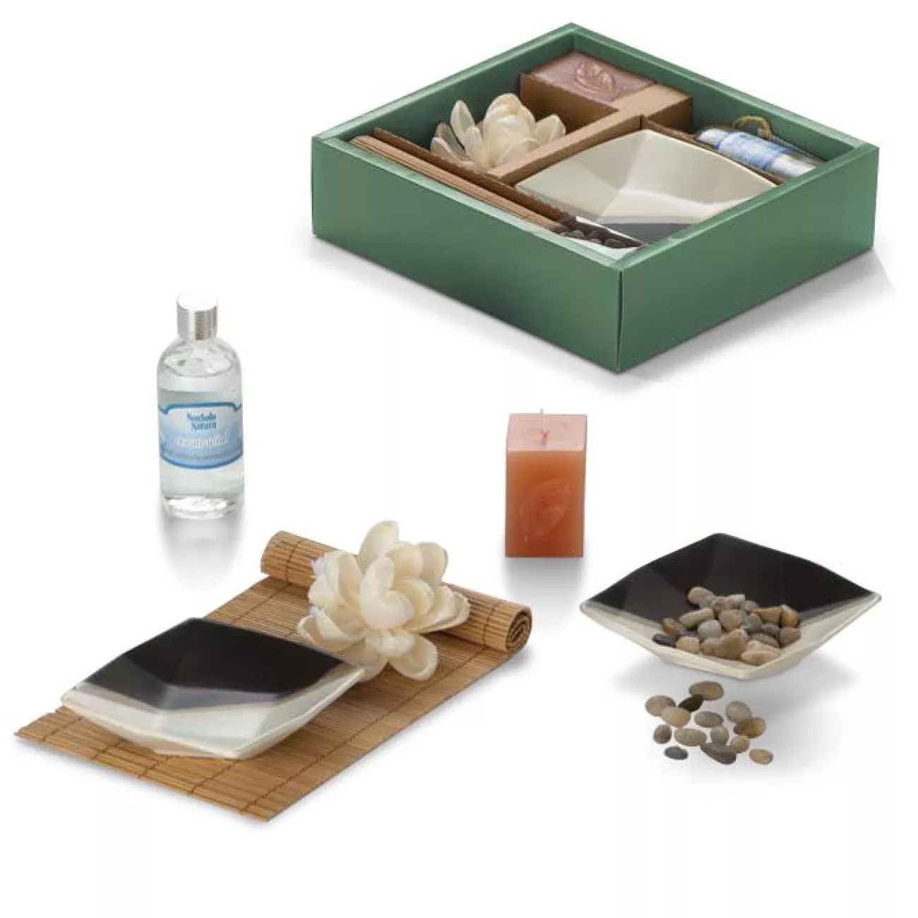 Подарунковий набір ROMANTIC від Foppapedretti призначений для прийняття ванни з аромомаслами. У складі набору "Романтик": пляшечка з фірмовим аромомаслом, керамічні блюдця для каміння, бамбуковий килимок, свічка, пінополіетиленова квітка під дифузор.