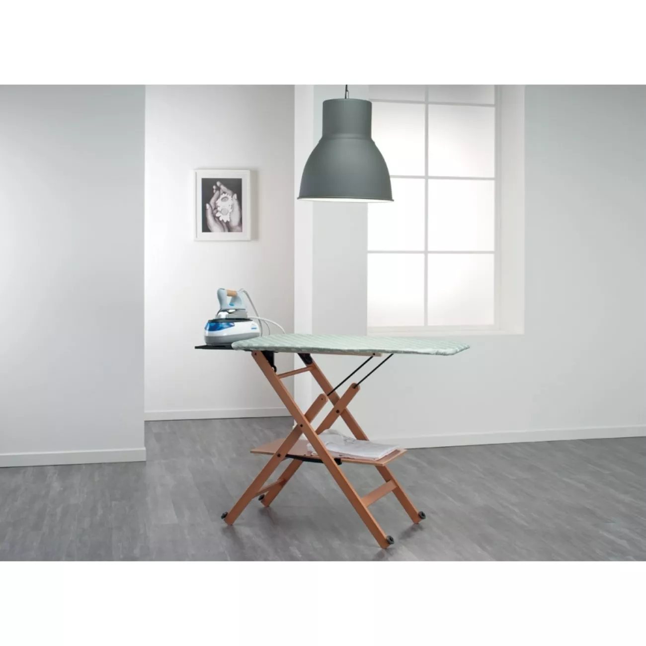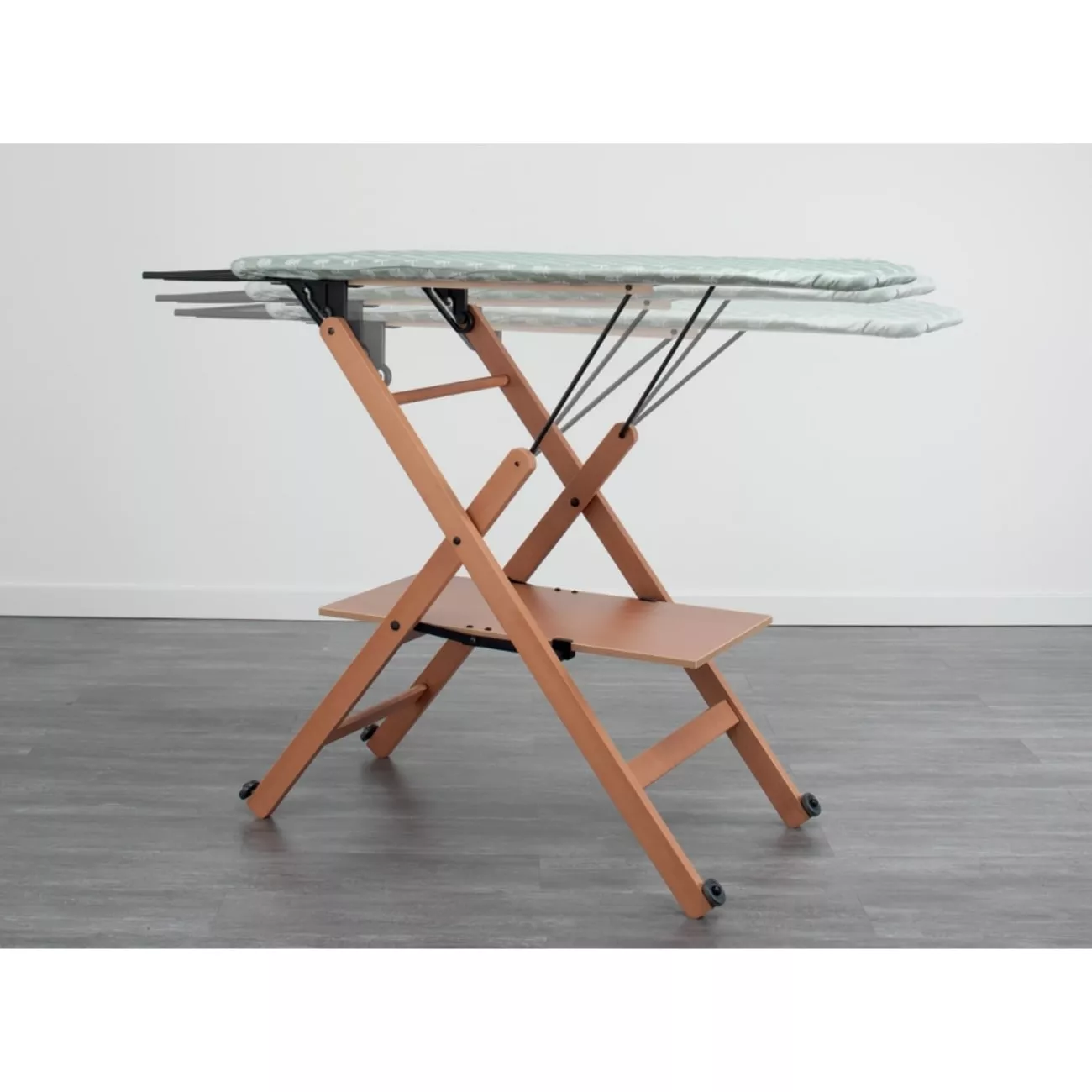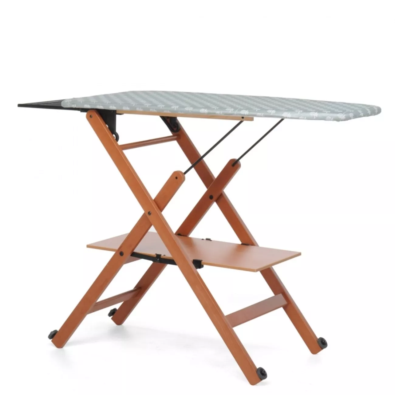 Деревянная гладильная доска Assai от FOPPAPEDRETTI покоряет сердца домохозяек во всём мире! Благодаря запатентированной конструкуии экономит время глажки в 2 раза. В сложенном состоянии занимает всего 14см и легко перемещается на колесиках.  Высота регулируется в трех положениях, доска устойчива во время интенсивной глажки. Под рабочей поверхностью размещена полка для поглаженного белья.