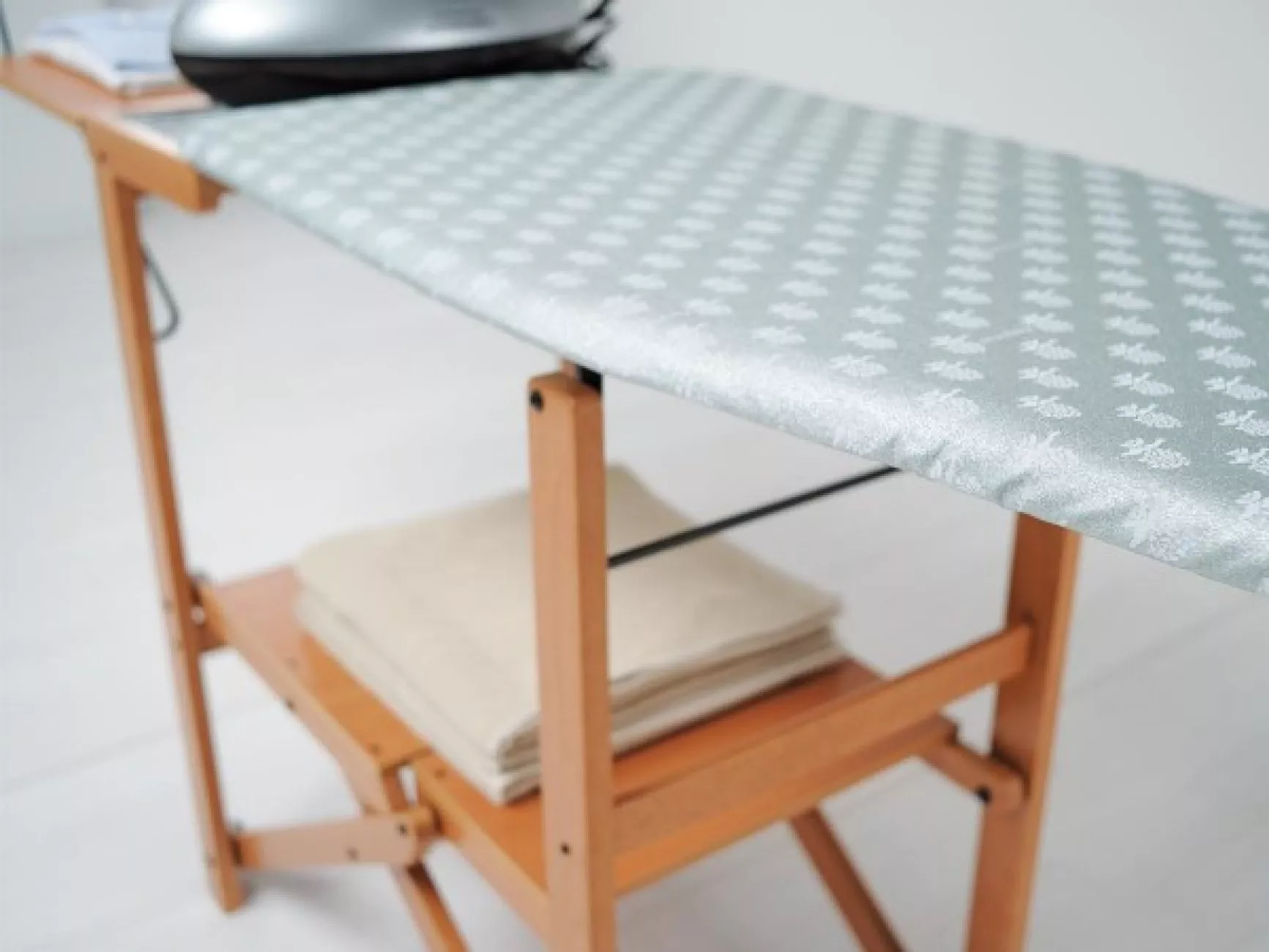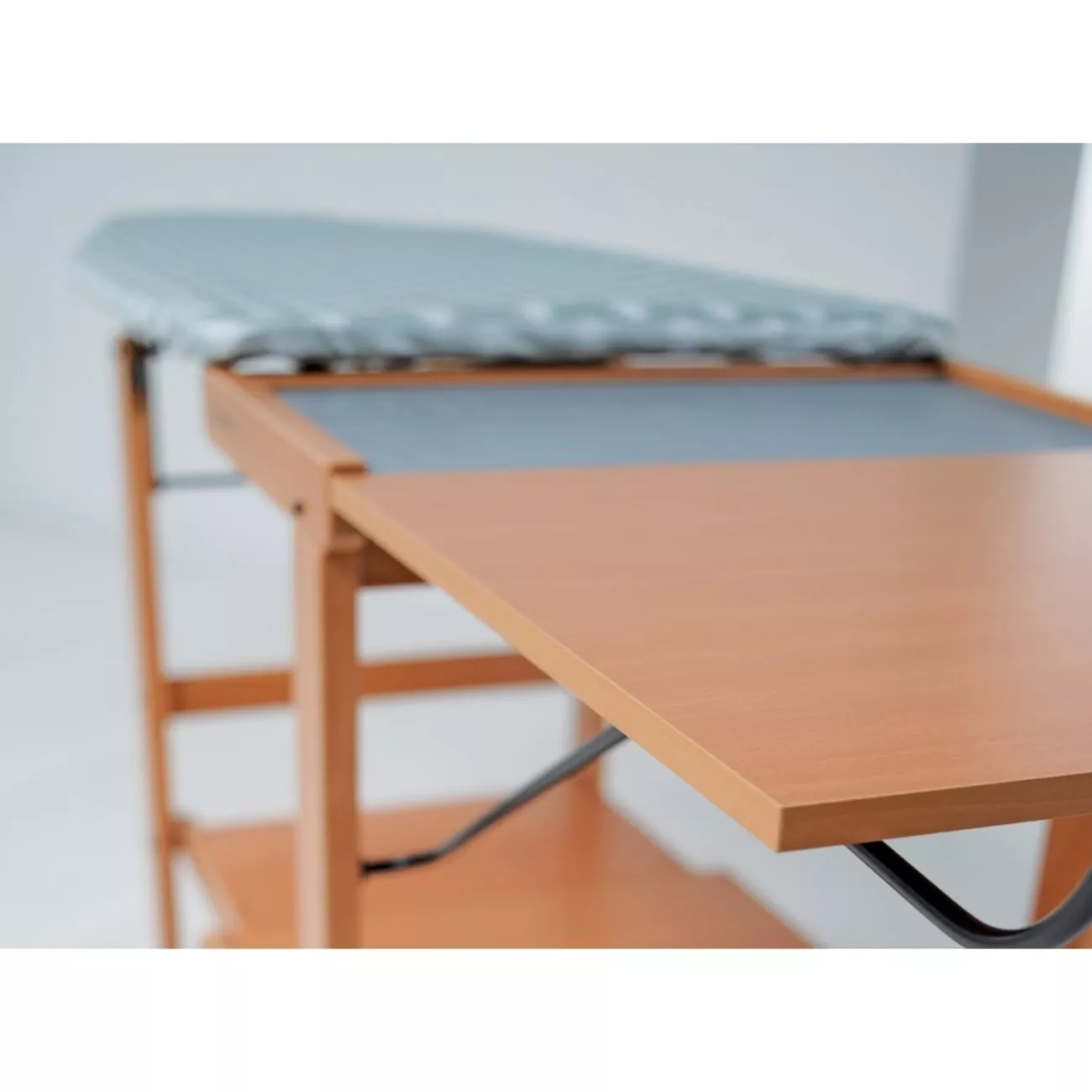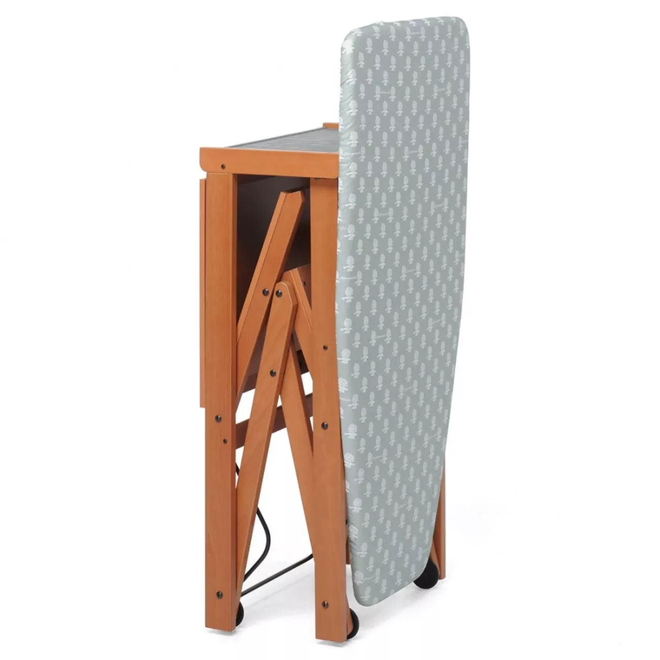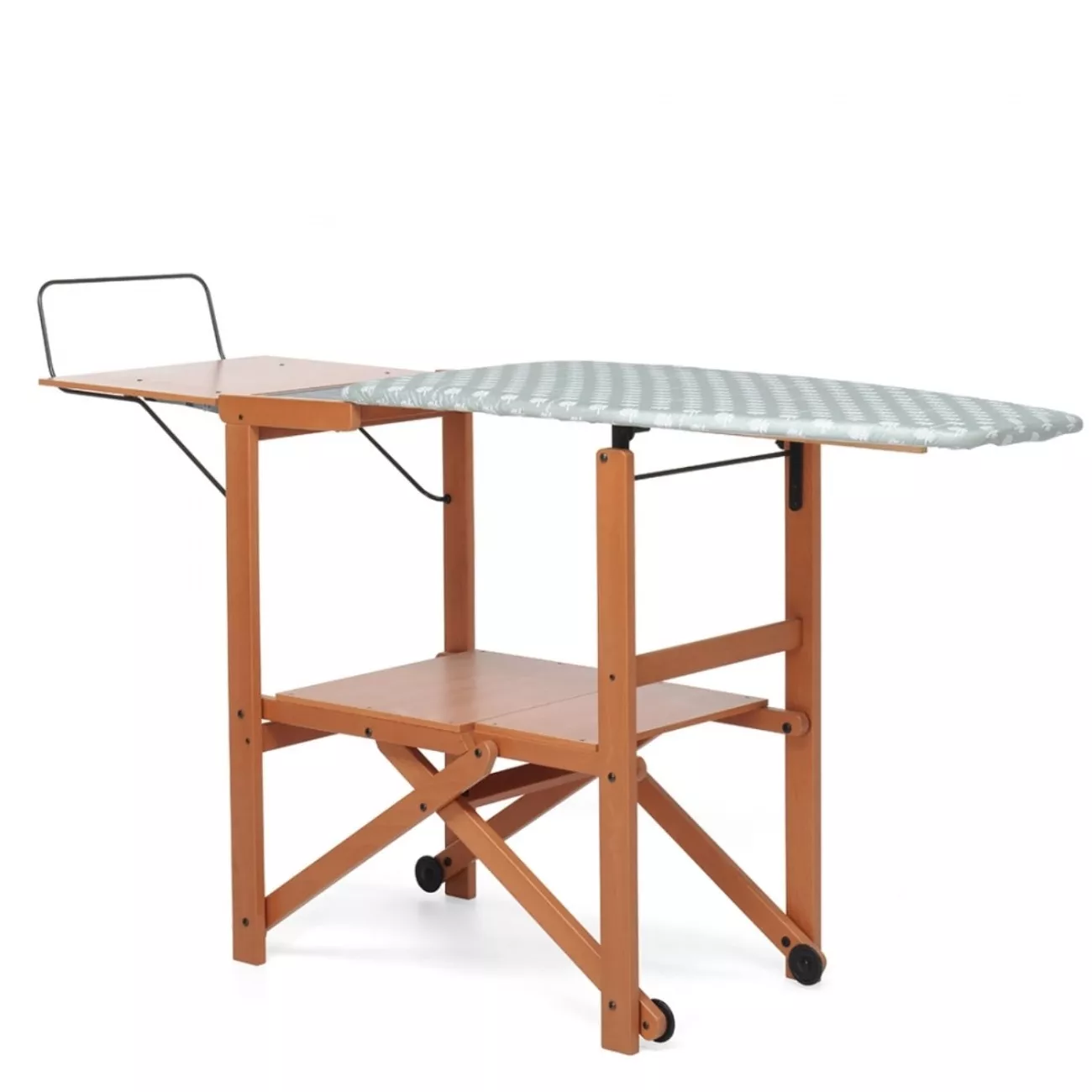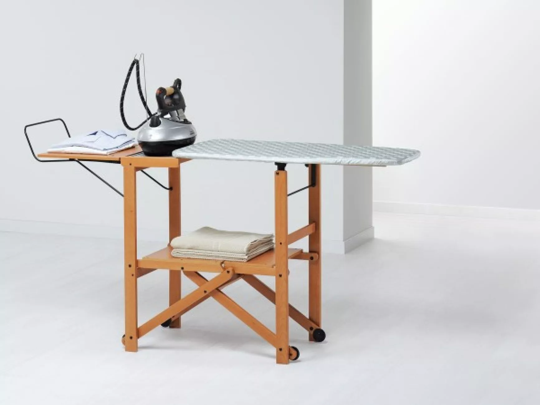 Складная гладильная доска Asso от FOPPAPEDRETTI имеет несколько полок для поглаженного белья. Под гладильной поверхностью, а также сбоку платформы для утюга расположены полки для белья. Это позволяет не только аккуратно складывать вещи, но и обеспечивает удобное разглаживание комплектов постельного белья. Боковая полка завершается стальным держателем для плечиков. В сложенном состоянии удобно перемещается на колесиках.