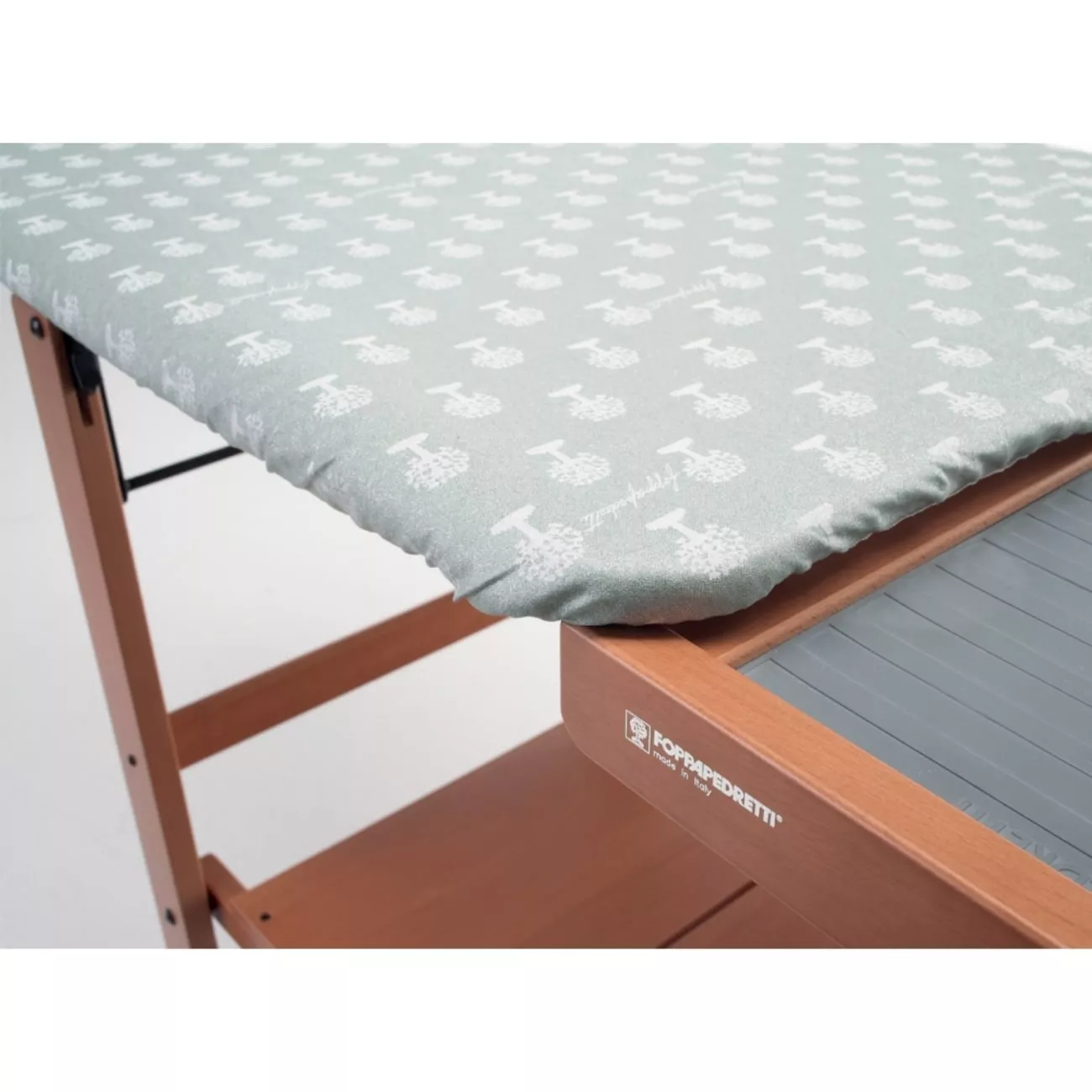 Материалы рабочей поверхности – перфорированная плита, подкладка из полиэфирного волокна, чехол с антипригарными свойствами (метализированная ткань на хлопковой основе). Рабочая поверхность всех гладильных досок Foppapedretti запатентирована, обеспечивает быстрое разглаживание вещей, эффект «глажки с двух сторон». Подставка для утюга – жароустойчивая резина.