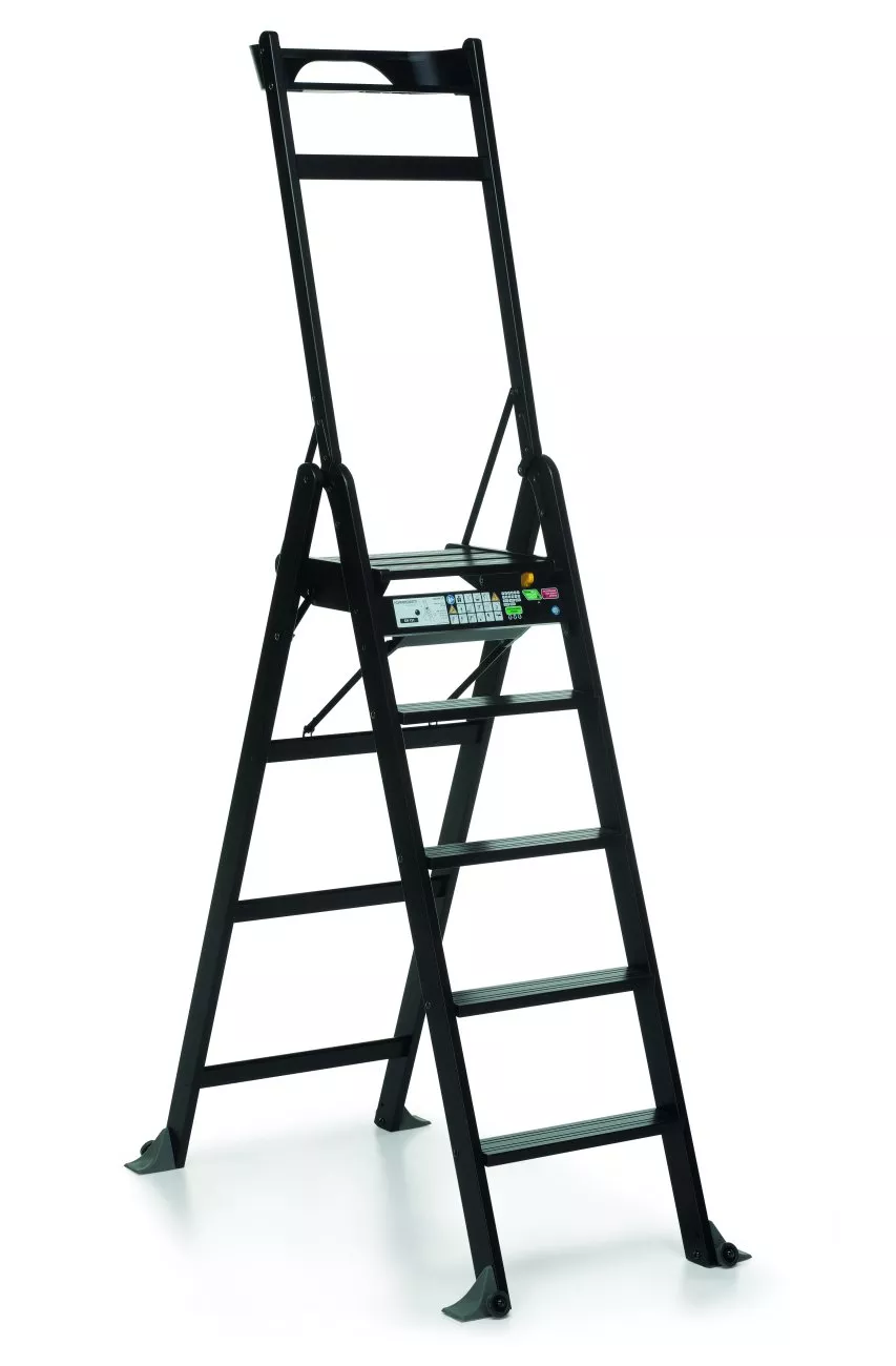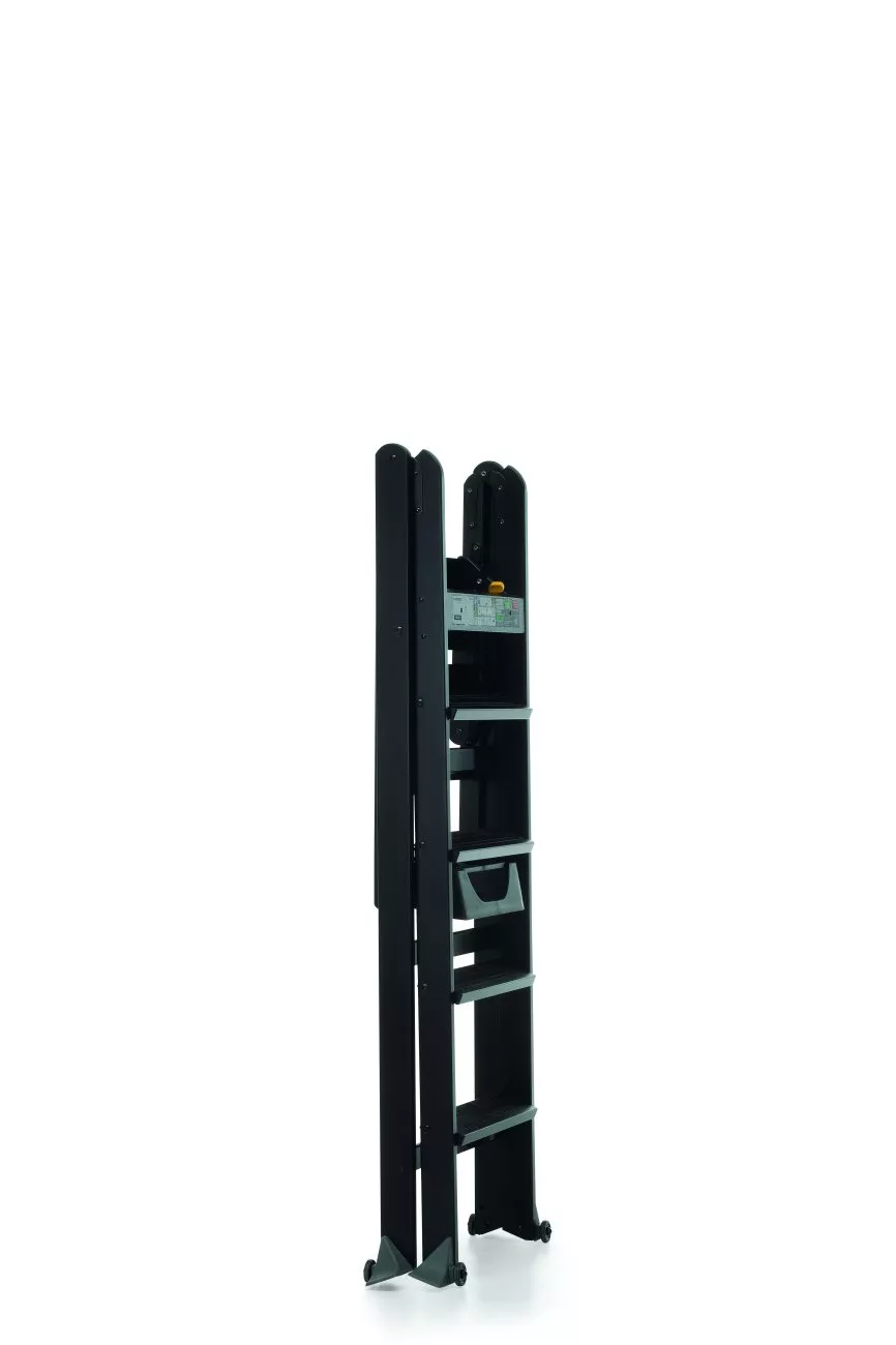 Складная бытовая стремянка-трансформер на 5 ступеней. Выполнена из массива бука. Устойчивая и безопасная. Максимальная нагрузка – 150 кг. Нескользящие ступени и платформа также выполнены из бука. Вверху размещена удобная полочка для инструментов. Стремянка « Ла Скала» легко складывается  и раскладывается. Ножки - с прорезиненными накладками (для безопасной эксплуатации). В собранном состоянии стремянка-трансформер LaScala легко перемещается на колесиках.