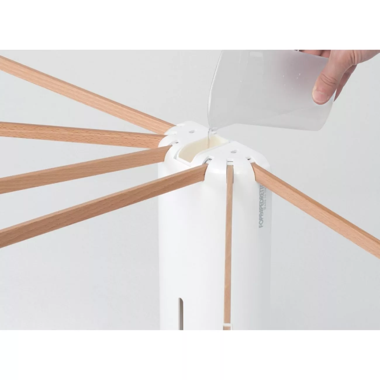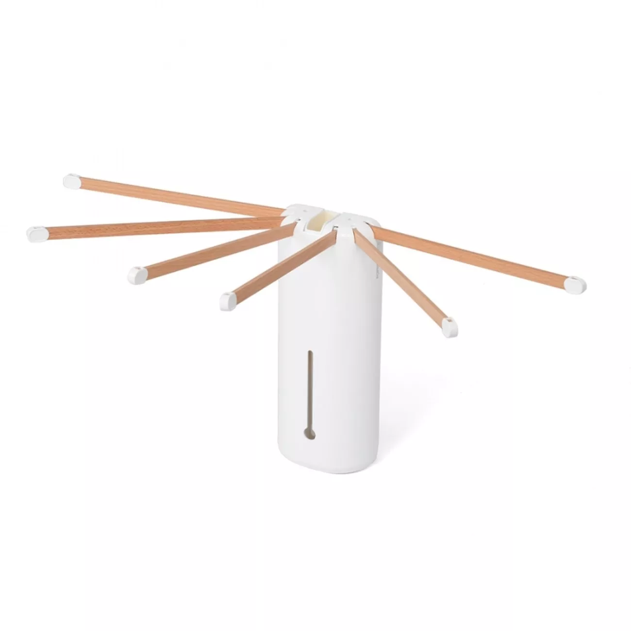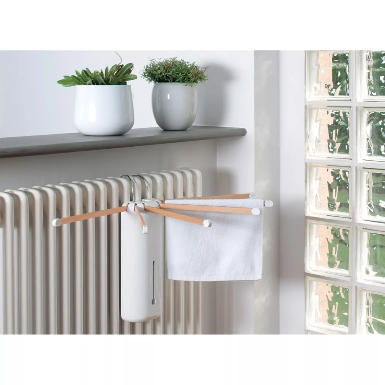 Сушилка для белья Plus разработана специально для крепления на батарею, ее удобно использовать также на полотенцесушителе в ванной комнате. Это компактная сушилка также сдержит конейнер для воды, тем самым выполняет функцию увлажнителя воздуха. Из пластикового корпуса легко выдвигаются 8 деревянных стержней для развешивания полотенец или белья.