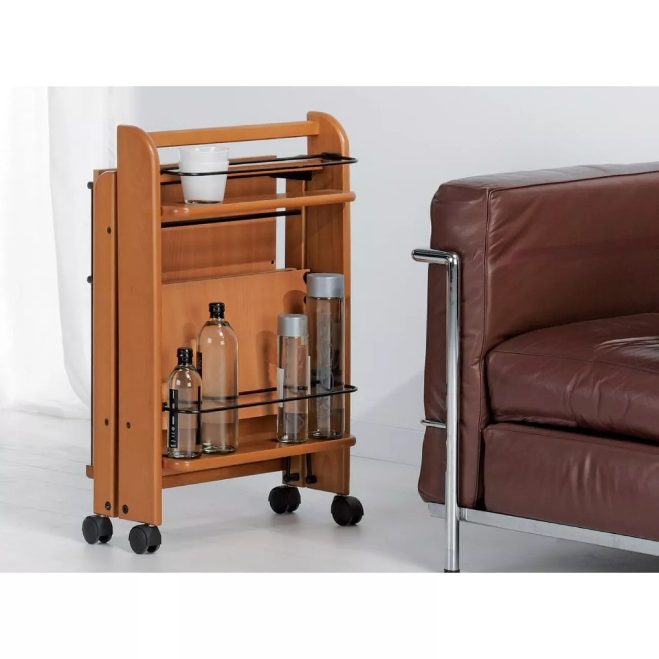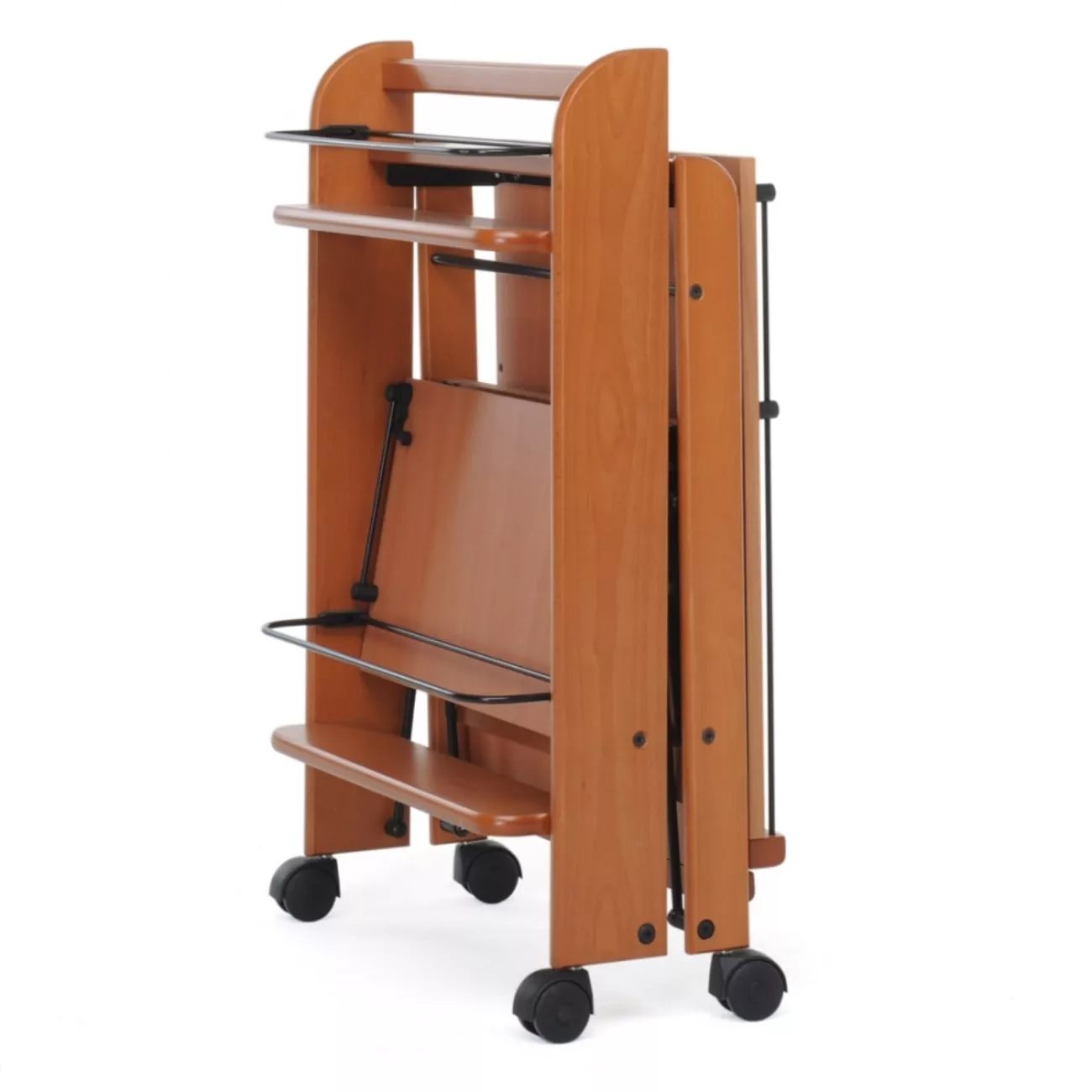 Сервировочный столик складной. Стоик «Сервиче» не только удобный и функциональный, - его дизайн удачно дополнит интерьер Вашего дома. Столик Service выполнен из дерева бук, с элементами ламинированного ДСП, борты на полках выполнены из стали. Все сервировочные столики от «Фоппапедретти» удобно перемещаются на колесиках, а в сложенном состоянии занимают минимум места. Столик Service  складывается и раскладывается очень удобно, в сложенном виде полочки остаются в фиксированном положении, они позволяют всегда иметь необходимые предметы под рукой (например, бутылки). Каждая полка выдерживает максимальный вес 5 кг.