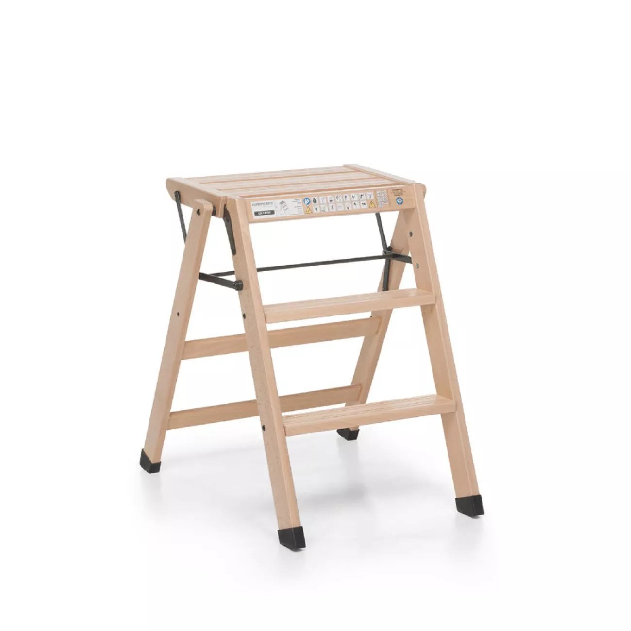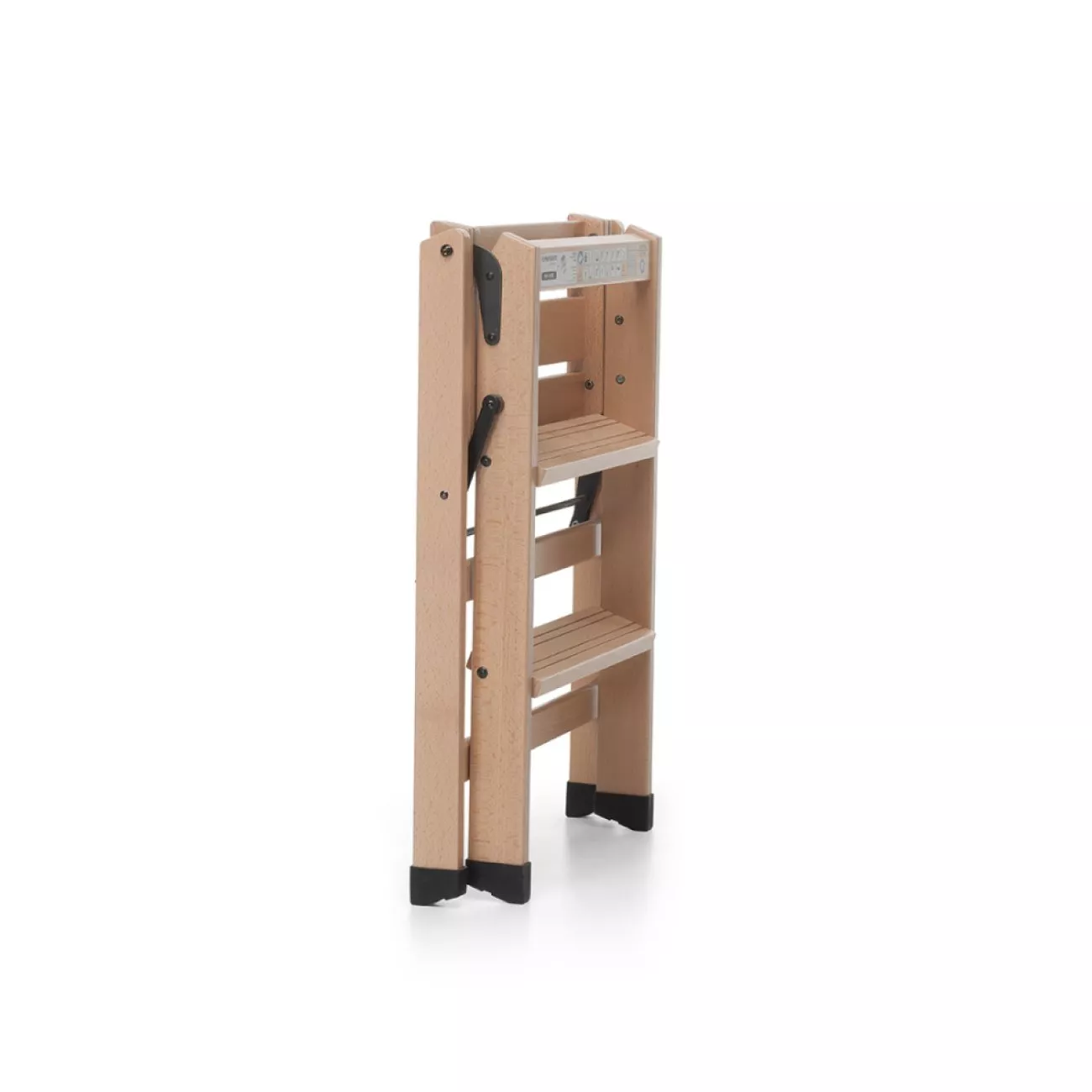 Складная деревянная стремянка-табурет. Надежная и устойчивая, максимальная нагрузка 150 кг. Основной материал стремянки – массив бука, ступени и верхняя платформа – также выполнены из бука со специальными прорезями, которые препятствуют скольжению. Прорезиненные накладки на ножки обеспечивают устойчивость. В закрытом состоянии стремянка Tialzo занимает минимум места.