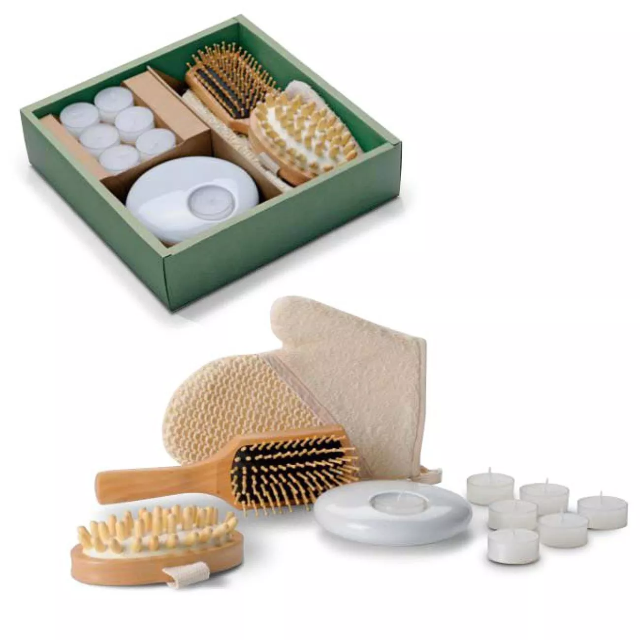 Подарунковий набір SPA від Foppapedretti складається з: керамічного свічника з сімома свічками, гребінець та масажна щітка з дерев'яною рукояткою, рукавички із сизалю.