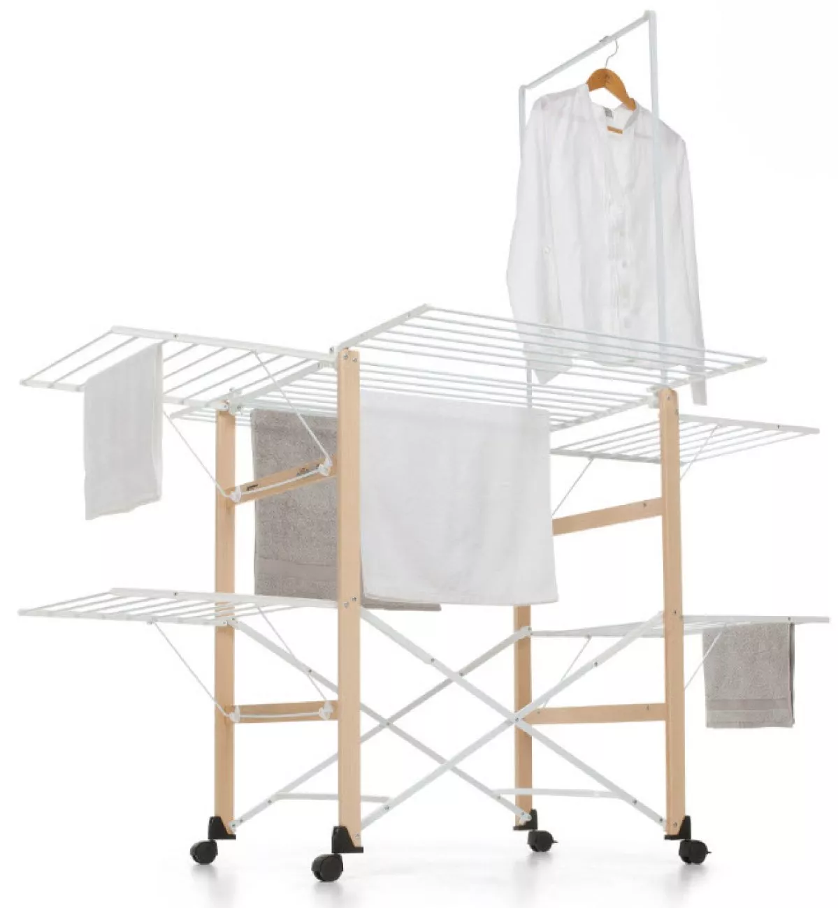 Товщина алюмінієвих стрижнів для розвішування білизни дозволяє уникнути заломів на тканині, що значно спрощує процес прасування. Бічні та фронтальні «крила» – відкриваються в залежності від кількості речей, які необхідно висушити. Складаний кронштейн дозволяє розвішувати сорочки та сукні на плічках, забезпечуючи рівномірне висихання.